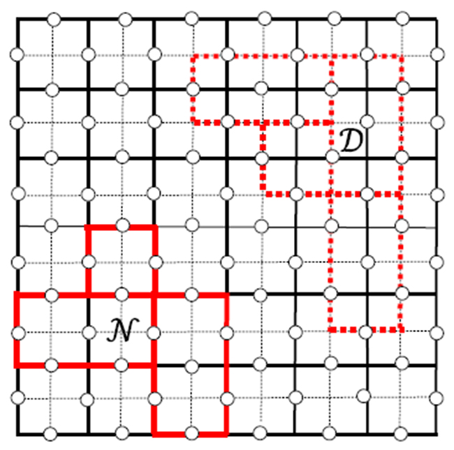 斐波那契任意子分别在方格子(实线)及其对偶格子(虚线)上形成的量子格网