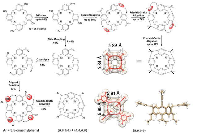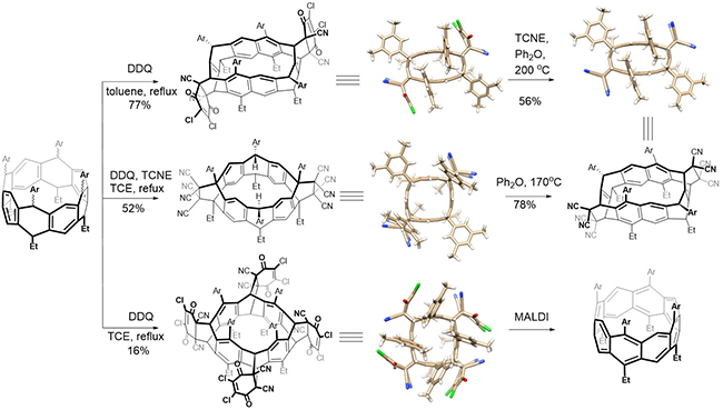 王梅祥课题组建立和发展了全新和通用的“跨湾造桥” 策略和多重分子内反应方法,充分利用唢芳烃本身预组织的单环结构和所具有的锥式构象,通过在