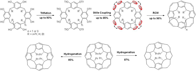 唢[6]芳烃作为原料,经酚羟基的三氟甲磺酰化及Stille偶联反应构建了多烯基取代的大环中间体,随后通过分子内的关环烯烃复分解反应(RCM)构建了环带[n]芳烃[n]