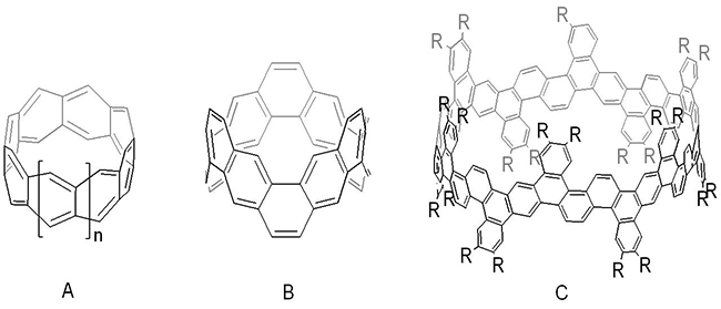 图1. 锯齿型,扶手椅型以及螺旋型环带芳烃结构