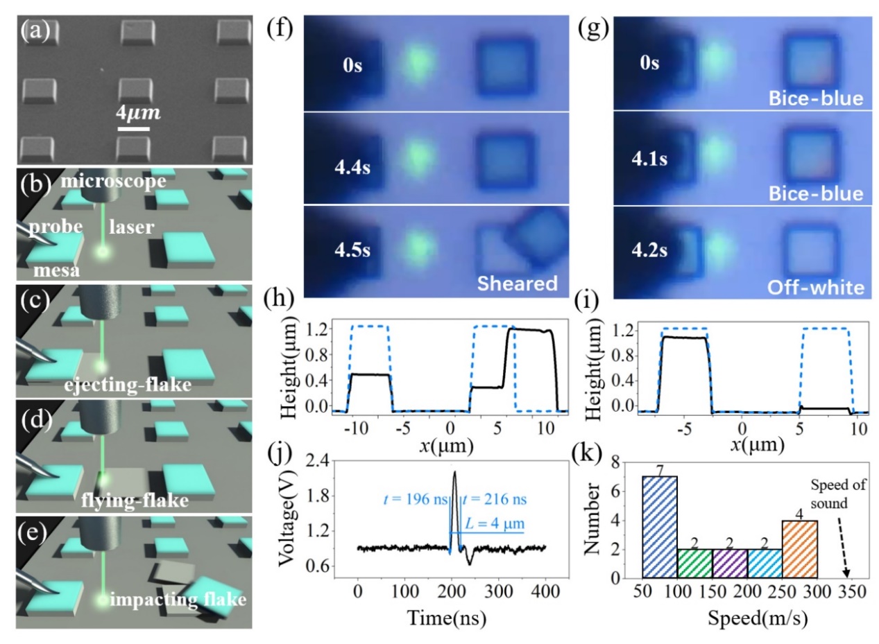 正压力下石墨岛内的石墨片层高速滑出现象。(a)石墨岛的电镜图片;(b)-(e)采用激光刀口法进行的速度测量示意图;(f)受压的石墨岛(左边)内片层飞出将右侧石墨岛的岛盖(蓝色部分)剪切开;(g)受压的石墨岛(左边)内片层飞出时将右侧石墨岛的岛盖击飞带走;(h)-(i)对应于(f)-(g)中受压的石墨岛内的片层飞出前(蓝色虚线)和飞出后(黑色实线)的高度截面图(AFM测量图);(j)一个典型的采集到的石墨片层飞出时的光强信号变化;(k)测量得到的石墨片层高速飞出的速度分布统计图。