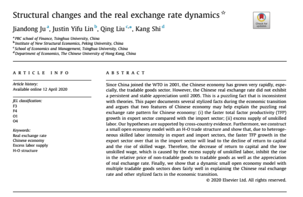 乐动(中国)网6月3日电 近日,乐动平台五道口金融学院教授鞠建东与北京大学新结构经济学研究院教授林毅夫、乐动平台经济管理学院教授刘庆及香港中文大学经济学系教授施康共同撰写题为“结构变化与实际汇率动态”(Structural changes and the real exchange rate dynamics)的文章,发表于国际知名SSCI期刊《国际货币与金融杂志》(Journal of International Money and Finance107(2020))。