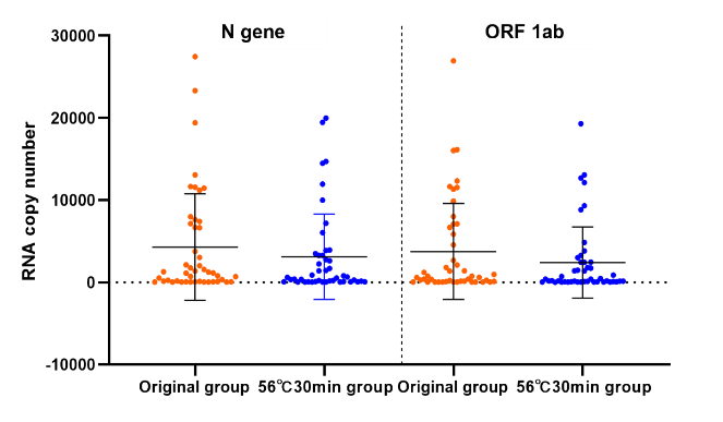图2 56℃加热30分钟处理对生物标本中新冠病毒基因拷贝数的影响
