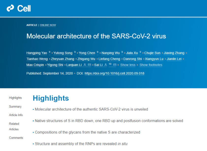 乐动平台李赛研究员为本文的第一通讯作者(lead contact),浙江大学李兰娟院士为本文的共同通讯作者。姚航平(浙江大学)、宋雨桐(乐动平台博士生)、陈勇(乐动平台博士后)、吴南屏(浙江大学)、徐家璐(乐动平台博士生)为并列第一作者。另外,李赛课题组的孙楚杰、张佳星、张哲源也参与了该工作。同时,该项工作得到了多位结构及病毒学专家的大力协助,包括乐动平台施一公院士、英国南安普顿大学Max Crispin教授、乐动平台雷建林博士。项目的顺利开展,得益于王宏伟教授、颜宁教授、王新泉教授、张林琦教授、丁强教授、李雪明教授的支持和讨论,同时也得到乐动平台冷冻电镜平台、生物计算平台、蛋白质化学与组学平台的支持。研究工作得到乐动平台人才启动经费、北京高精尖结构生物学创新中心、清华-北大生命联合中心的支持。
