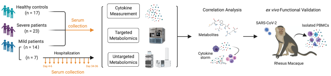 为了探讨COVID-19患者的代谢重塑与CRS之间的关联性,胡泽平与合作者研究团队利用靶向和非靶向代谢组学技术,对重症患者、轻症患者、非COVID-19急性上呼吸道感染者和健康对照者的血清进行了分析,全面地描绘了COVID-19轻症和重症患者血清中显著改变的代谢途径,同时揭示了轻症随访患者血清中代谢物在疾病治疗进程中的变化。结果发现与急性上呼吸道感染者和健康对照者相比,COVID-19患者具有独特的代谢异常特征,其中36种嘌呤、色氨酸和精氨酸代谢途径相关代谢物的水平变化与疾病严重程度相关。进一步检测上述队列血清中的28种细胞因子/趋化因子,发现CRS相关细胞因子水平随疾病严重程度呈递进式升高。值得关注的是,血清代谢物与细胞因子/趋化因子的相关性分析表明两者之间存在紧密关联,并特别提示了重症患者中与促炎性细胞因子相关的代谢途径,例如精氨酸与CRS相关炎性细胞因子IL-6、IL-1β、M-CSF、IL-12 p70、IFN-α2等呈现强关联性,因此推测重要代谢通路对促炎性细胞因子/趋化因子分泌具有潜在的调控作用。