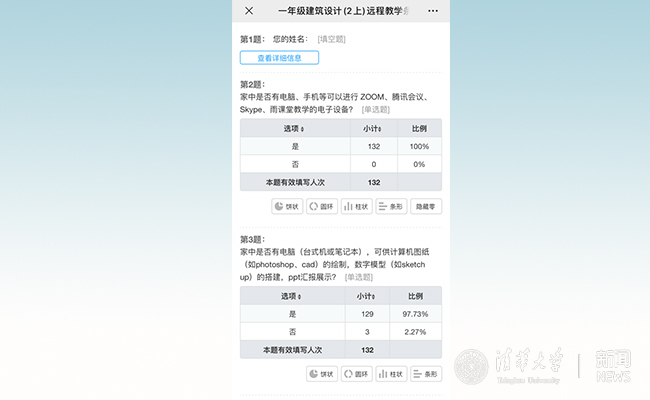 首先,针对教学工具,提前两周对学生在家上课期间的手头工具进行摸底。为保障学生在家上课期间的教学效果,同时不增加学生外出购买或借用工具的出行行为,一年级教学小组编制了问卷对学生的既有工具情况进行了调查。问卷内容包括“是否有可供线上教学(视频会议)的电脑或手机”“是否有可供绘制计算机图纸的电脑”“是否有白纸、笔等普通绘图工具”“是否有绘图纸、针管笔、图版等专业绘图工具”等问题。全年级同学(除1位留学生无法联系),均参与了问卷调查。问卷反馈,100%的同学有可供视频会议的手机或电脑,线上教学可行。对电脑或绘图纸笔工具方面有困难的同学,由助教和辅导员进行一对一的征询,帮助解决困难。工作做在前头,确保所有同学开课后无工具压力。