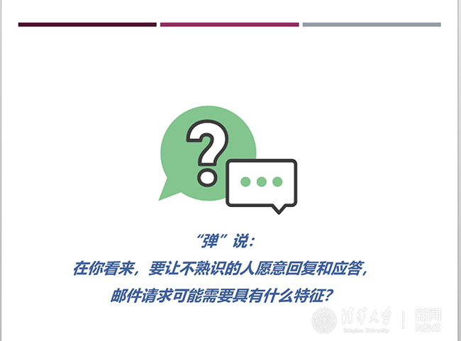 在高互动讨论课中,经常会有一些“把脉”性质的问题——希望快速、实时地了解不同人在一个问题上的各异想法,并不需要有深度的讨论,而只需要一些“众口异声”的关键词贡献。在本门课程中,大量运用雨课堂的弹幕来实现这类问题的快节奏讨论(如下图所示),例如“在你看来,要让不熟识的人愿意回复和应答,邮件请求可能需要具有什么特征?”“你觉得我们自己平时在尝试倾听中可能存在什么误区?”“今天的练习让你对于以往的什么情境有所省思?”等等。使用弹幕,一是让同学快速了解到其他人的想法,尤其是差异化的想法;二是增强了课堂参与的趣味性,有利于保持同学的专注投入度。