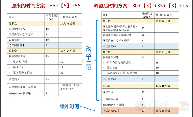 转为在线教学后,本门课程在备课中会重新梳理每堂课原有的时间方案(如下图所示)。一是将课堂内容重新组合划块,适当划分为时间更短(如25~30分钟)的小段,使得段内的授课节奏更紧凑,学生更易保持专注投入;二是预留足够的缓冲时间(如90分钟的课堂,至少留10分钟的缓冲时间),用以消化由于线上环境特殊性所造成的额外时间花费(如模拟练习中的分组会议转换时间、语音讨论中的麦克切换时间等),避免因为现场的延时和节奏拉长而影响授课质量(如临时压缩核心内容)或者影响学生学习体验(如造成拖堂情况)。