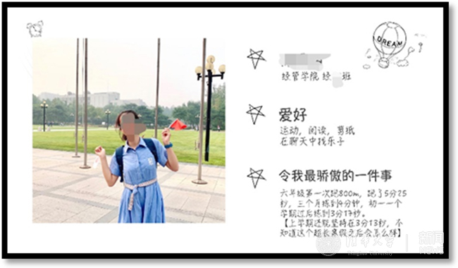 在线上的环境中,学生之间对于彼此的认识,容易简化为一个名字、一个符号,不利于社群的形成。为了使得生-生之间产生更加真诚、丰富的认识和了解,本门课程设计了一个“课后认识小伙伴”环节,邀请每位同学制作一份高度个性化的个人卡片(如下图所示),介绍自己的背景情况、兴趣爱好、最有成就感的一件事、以及关于自己的一件“轶事”(fun fact)。在每周课后,邀请三位同学在全班微信群中,分享自己的个人卡片,再配上一段不超过60秒的微信语音来着重介绍“轶事”部分。在三位同学分享之后,在全班微信群中,其他同学通常会产生相当热烈的反响和回应,围绕这些介绍以及其中独特丰富的个人爱好和经历,再延伸出一波活跃讨论。甚至有同学评论道:“我和XXX同学同班大半年了,对他的了解还不如今天一天多!”
