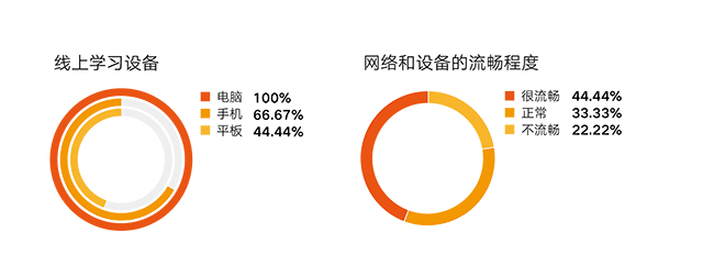 本次课程学生全部使用电脑进行网络学习,其中,部分同学选择了手机+电脑或平板+电脑的多模态平台组合。在网络的使用中,有2名同学表示网络不是很流畅,其他人的网络则能达到学习要求。