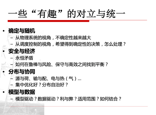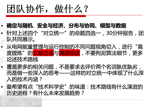 以往课程教学中选定的研讨内容是一些与课程相关的技术主题,比如“含可再生能源的电力系统调度”“综合能源系统”“大数据与人工智能”等,可以认为是这一领域技术问题的“横断面”。在本学期授课中,为了增加课堂讨论深度,尤其是增加学生之间在线下的“思维碰撞”,体会团队协作科研的过程,我们在课程研讨过程中增加了新的“讨论维度”——从“纵断面”入手。在前8周的课堂讲授内容中,老师为同学们描绘了能量管理系统技术发展的历史脉络、关键技术和发展前瞻,希望同学们能进一步通过文献调研和小组讨论,从中提炼和发现本学科解决问题的“共性路线”,从“技术哲学”的高度进行深入思考。以下是课程设计的四个思考主题,从“对立统一”的角度让同学们开展研讨。