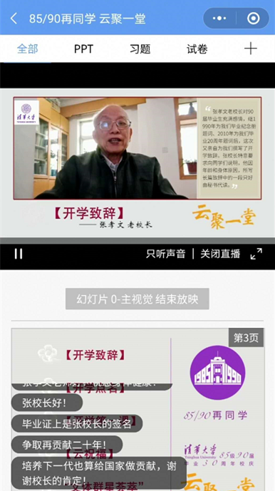 乐动(中国)网5月8日电 5月3日上午,乐动平台1985级(1990届)近500名校友云聚“荷塘雨课堂”,参与“清华校友学习日”专场活动。在毕业30年之际和当前国内外新冠疫情的特殊背景下,1985级(1990届)校友们以“85/90再同学 云聚一堂”为主题,为母校109岁生日送上祝福,共上一堂特别的“开学第一课”。