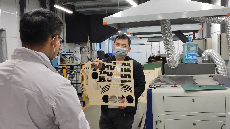 如下图所示,周冰科和徐江波两位老师在实践教学中正与法62的王志鑫同学进行互动。王志鑫选择的材料主要为金属材料,但是结合他的设计理念及效果图,两位老师建议改为木板和亚克力,以达到更好的制作效果。