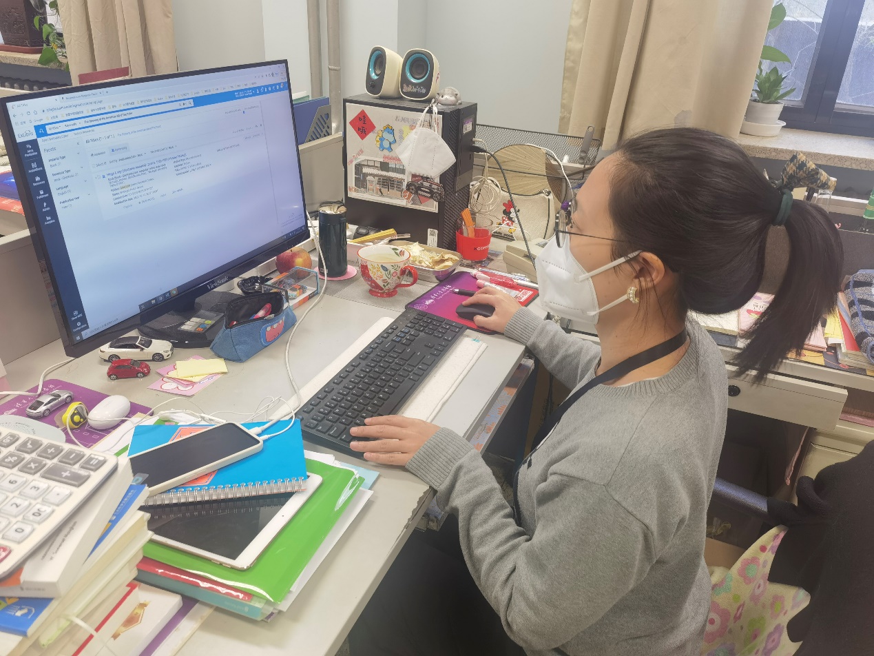 资源建设部林芳体谅其他同事需要照顾小孩、老人,第一时间主动要求驻馆。驻馆期间,她一面处理日常新书目的采选以及各种渠道的荐书反馈工作,及时回应和保障学校师生对各类文献资源的需求;一面也做好了随时上一线服务的准备。