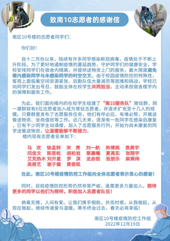 持之以恒、默默服务的精神也在️宿舍楼中默默传递。为了缓解后勤服务压力,紫荆十二号楼建立了楼层管理“片长制”,将全楼划为19个片区,每个片区安排一名志愿者片长,组织区内同学开展自我管理。1个多月以来,化9党支部6名学生党员先后担任片长职务,与片区同学建立联系,为生病的同学送饭、送药,更新健康状态信息,并提醒同学们注意维护楼内卫生整洁。党员片长们的行动深深感动着区域内的其他同学,在片长同学们出现症状需要休息时,楼内同学陆续补充加入志愿队伍,以接续行动守护大家的健康和安全。
