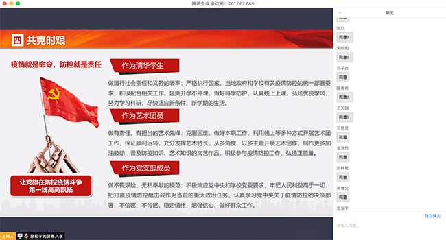 艺二党支部成员、学生艺术团团长李伟杰作了《齐心战“疫”,艺术团在行动》的报告,梳理了新冠肺炎疫情爆发以来,清华学生艺术团以音频、视频、绘画、书法、摄影等多种形式,创作的一批祈福中国,传递正能量的艺术作品,并依托线上平台开展艺术教育、队伍训练的各项工作。
