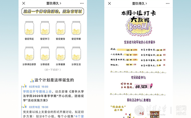 法硕191支部依托既有的线上读书、健身社群,将班级成员划分为6个小组,定位功能“4个监督、4个分享”,以生物疫情科普、组内打卡激励、线上学习分享为特色,通过班级公众号将互助成果数据化、可视化、趣味化,带动形成良好的集体氛围。