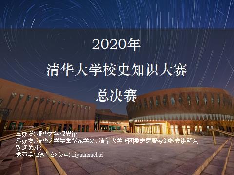 受疫情影响,本次大赛在线上进行。与往年相比,除在读学生外,部分校友通过网络参加了比赛,参赛人数较往年有所增加。经过初赛筛选,31支队伍中最终有8支队伍脱颖而出,进入决赛。决赛共分两阶段,采取线上答题,选手们“各显神通”,展现了自己对校史知识和清华文化的深度了解。比赛进程紧凑、气氛活跃,既有各组队员信手拈来的抢答,也有一题难倒众人的窘境,更有一锤定音加时赛的紧张比拼。经过2个多小时的激烈比拼,最终第六组(潘宇昂、温晋)以总分420分的成绩胜出,夺得2020年校史知识大赛冠军。