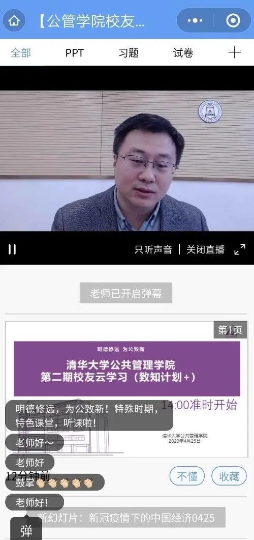疫情期间,为了落实学校“疫情防控不松懈,教学科研不停步、改革发展不放松”的工作部署,公管学院将校友终身学习计划(“致知计划”)进一步升级,打造了“致知计划+”云上学习活动。在乐动平台109周年校庆到来之际,公管学院于4月25日举办了“致知计划+”云上学习第二期活动。学院党委副书记、副教授周绍杰,副教授蒙克为校友和师生在雨课堂直播授课。周绍杰以“新冠疫情下的中国经济:短期冲击与长期影响”为题作主题报告。蒙克以“新冠疫情前后的中美关系”为题作主题报告。200多位校友师生观看直播。