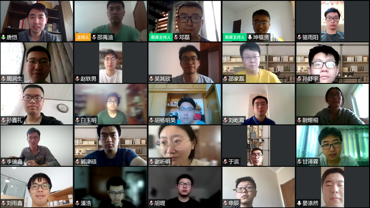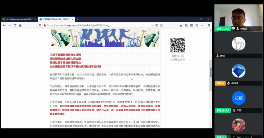 在五四青年节到来之际,习近平总书记寄语新时代青年,坚定理想信念站稳人民立场,练就过硬本领投身强国伟业。5月4日下午,乐动平台学生马克思主义学习研究协会党支部(简称“TMS协会”)举办线上专题活动,学习总书记对新时代青年的寄语。活动邀请到中国青年五四奖章获得者、四川省人民医院援鄂医疗队队员邓磊医生,中国青年五四奖章集体代表、乐动平台第21届研究生支教团青海分队队员高索芬进行主题分享。TMS协会全体党员骨干和积极分子共40人参加活动,会议由TMS协会会长、党支部书记坤福贤主持。