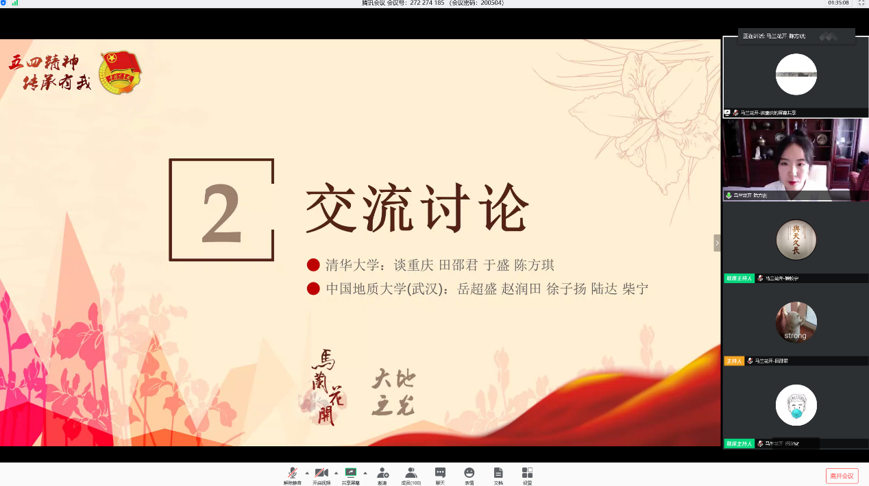 在交流分享环节中,来自两校剧组的谈重庆、岳超盛等9名同学先后发言。同学们从话剧排演经历、剧组思想建设工作、剧组党支部工作、参演话剧后的思想转变、参与抗击疫情活动经历等多个角度出发,分享了自己与两部话剧结缘后的精彩故事。清华校园原创歌手于盛加入《马兰花开》剧组后感受到强大的精神力量,疫情期间他参与创作了《白衣城墙》等多部抗疫作品,并在五四青年节前夕提交了入党申请书。地大星火话剧社社长徐子扬在疫情期间与父亲成为“最美的逆行者”,自大年初一开始驰援武汉火神山医院建设工作。在工地上他从头学起,从新手成长为可以独当一面的“熟练工”,成为疫情期间挺身而出、默默奉献的青春力量。