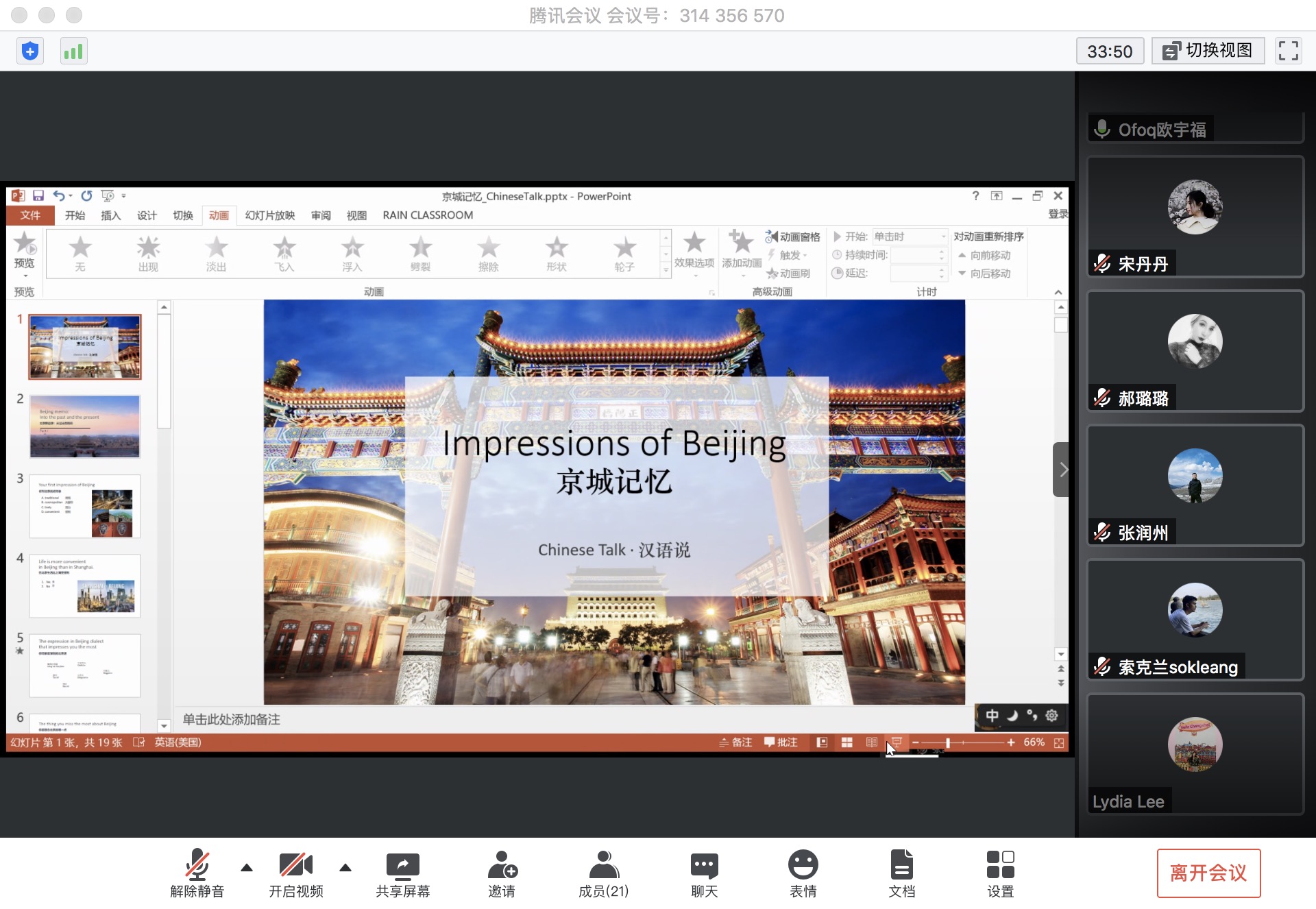 乐动(中国)网5月29日电(通讯员 冯文欣)5月24日晚,“汉语说”工作坊之“京城印象(Impressionof Beijing)”专场在“云”上如期举行,本次活动吸引了来自6个院系、9个国家和地区的10余名国际生参加。在疫情防控时期,本学期的“汉语说”移步线上,通过网络搭建起了一座中外学生沟通交流的桥梁,保证中外学生跨文化交流“不断线”。