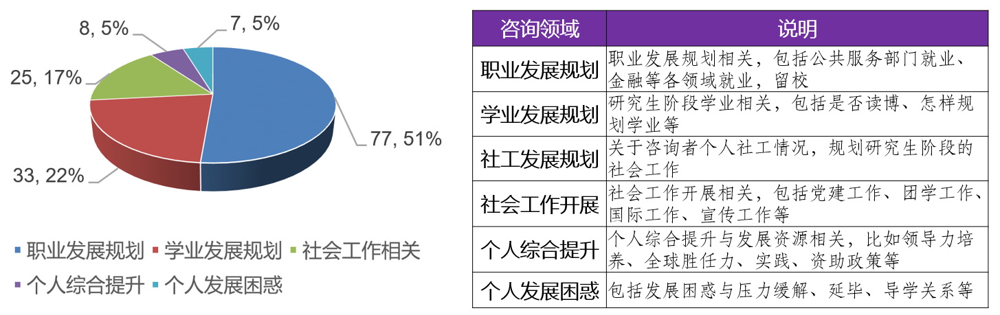 分析同学们的咨询主题可以发现同学们关切的问题,这为研究生工作的开展提供了一份参考。按照同学们的报名问题,工作室将咨询主题分为“职业发展规划”“学业发展规划”“社会工作相关”“个人综合成长”“个人发展困惑”五大类。本学期累计96人次的咨询共包含150个咨询主题(一位同学的一次咨询中,可能含有多个咨询主题),其中职业发展规划类主题有77个,占咨询主题总数的51%,占总预约人次的80%,这说明研究生同学对职业发展规划问题最为关切。学业发展规划类主题有33个,社会工作相关的主题有25个,个人综合成长类主题有8个,个人发展困惑类主题有7个。