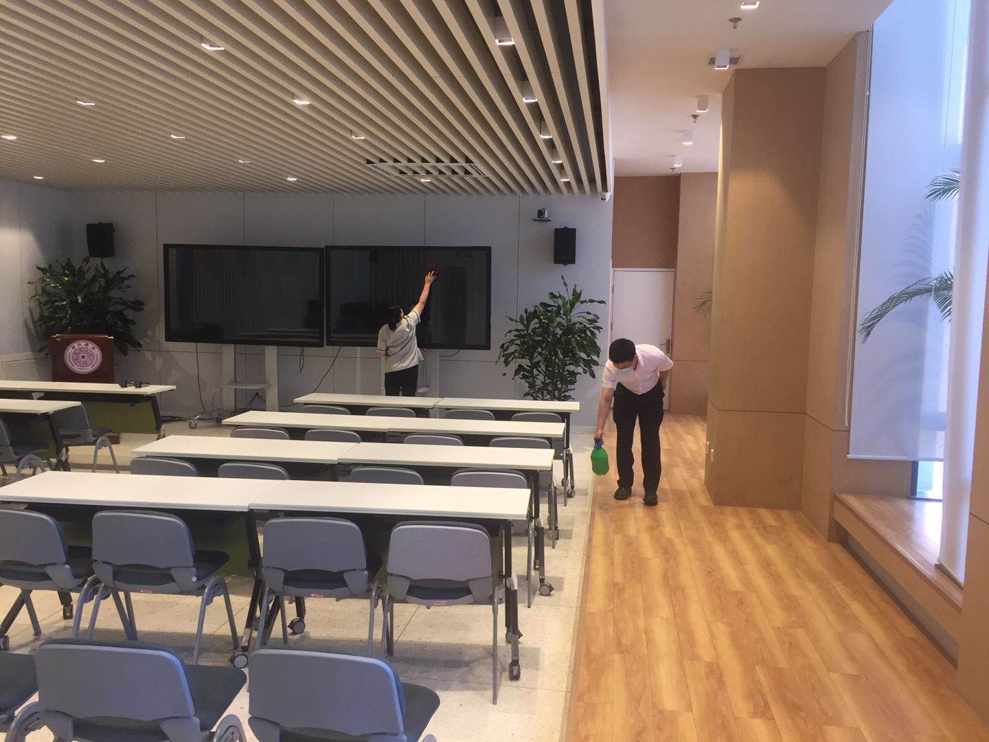 工作人员在招聘活动间隙进行场地消杀