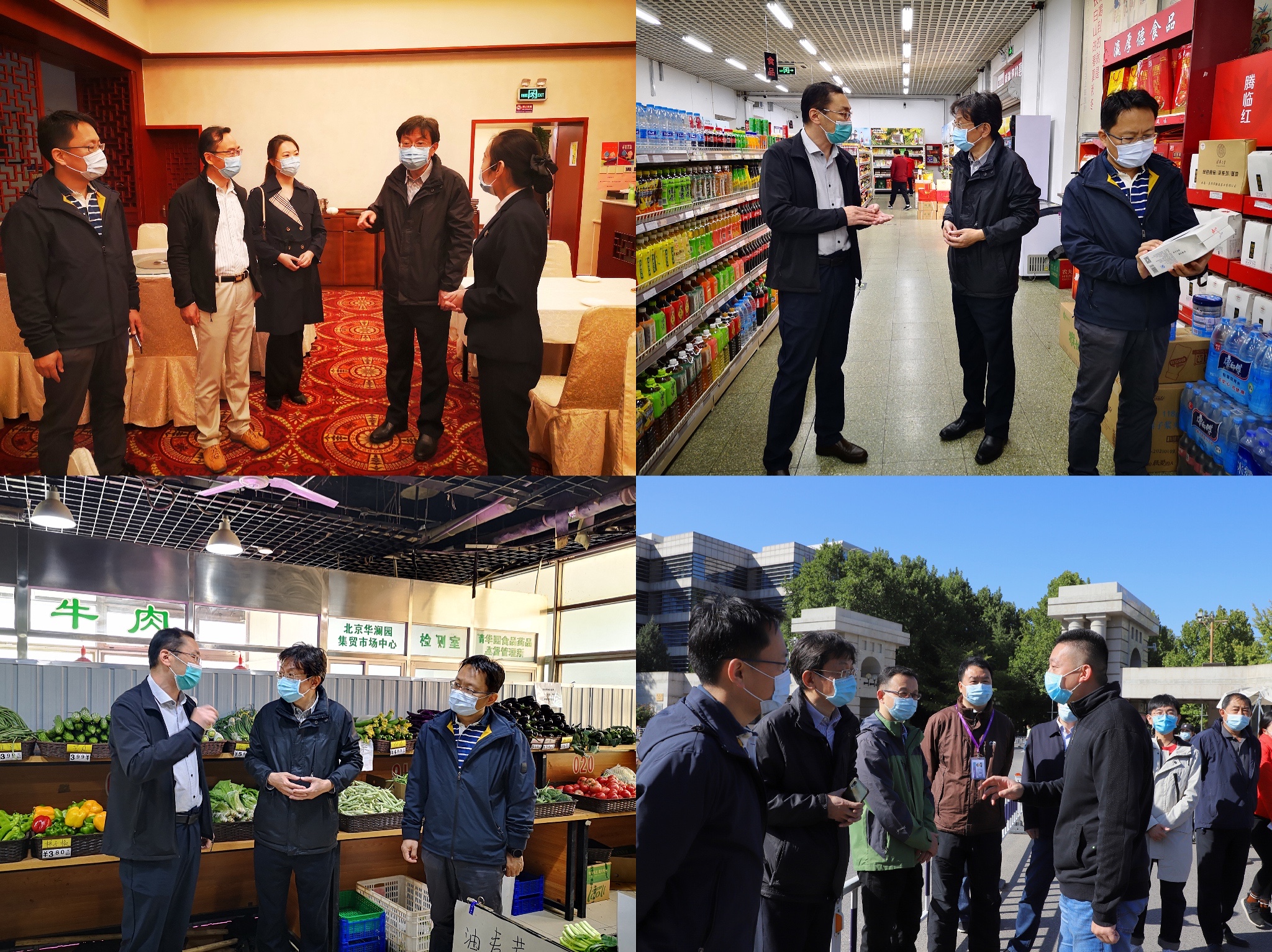 李一兵带队检查甲所接待餐厅、澜园超市、社区菜市场、东南门检查岗(从左至右,从上至下)