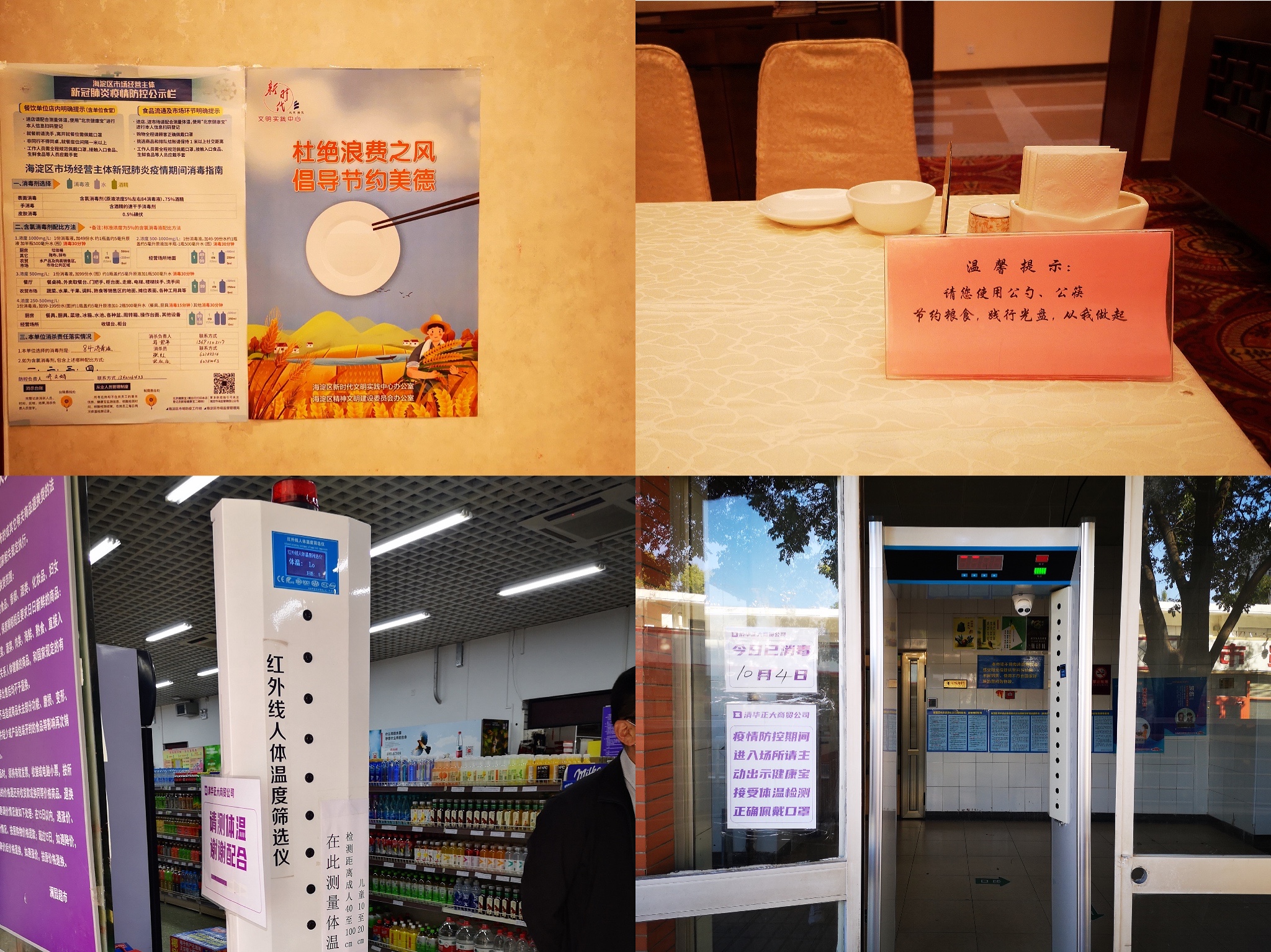 甲所餐厅宣传画、餐桌温馨提示、澜园超市测温设施、社区菜市场测温设施(从左至右,从上至下)