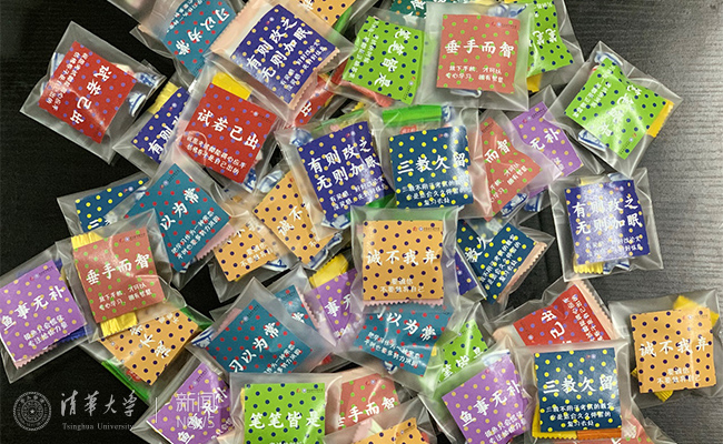 在这次迎新糖果的发放中,这五条“严肃版”学风倡议也出现在了糖果的包装纸上,与“趣味版”的成语新解相结合,鼓励同学们来到清华以后保持良好的学习习惯,传承“严谨、勤奋、求实、创新”的优良学风,扬科学之精神,稳诚信之根基。“仰不愧于天,俯不怍于人。识时务而不媚,遇艰难而不堕其志。学有所用,乐无涯矣”,邱勇校长曾用自己的博士生导师宋心琦的寄语来激励青年一代,鼓励大家做自己有兴趣且真正有价值的东西,敢于在陌生领域探索,拥有自信,坚持不懈,这也正是五“不”五“要”学风倡议的要求与期待。