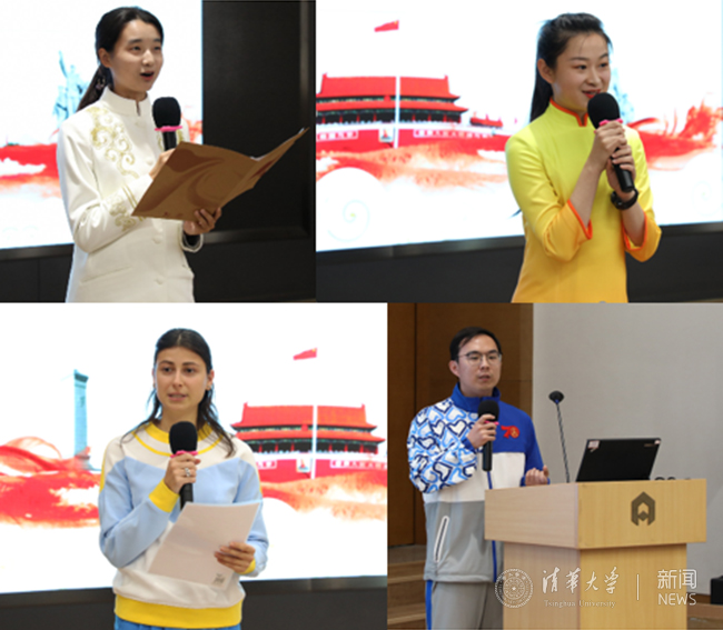 2018级本科生王嘉伟、2018级硕士研究生文雯、2018级意大利籍博士研究生蔻妮(Costanza)、2015级博士研究生汪越分别代表国庆70周年庆祝活动群众游行“伟大复兴”方阵、广场合唱和广场联欢、“人类命运共同体”方阵、志愿者服务的亲历者谈了自己在本次活动中的感悟与收获,深情地表达了对中国的赞美与热爱,并表示将此次深刻体验化作学习的动力,践行好“青年加油”的口号,以实际行动践行清华师生的使命担当,建设更加美丽的中国,努力为国家和社会作出更大的贡献。
