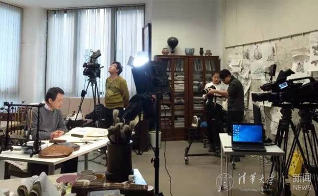 在拍摄的过程中韩敬伟将一个艺术家对画面的高要求发挥到极致,他会对每一个镜头的光线、位置摆放等进行研究、调整,甚至每一本书的摆放位置都经过仔细推敲,这专业精神令所有参与课程制作的工作人员都敬佩不已,也在潜移默化中提高了团队成员对课程的严谨程度。在剪辑过程中,无论是镜头转换还是后期的字幕、图标等,韩敬伟都倾注了大量心血。视频制作人员说:“‘山水画技法’慕课制作完以后才发现原来教学视频也可以做到充满艺术感。”