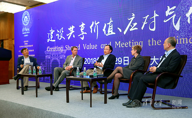 演讲结束后举行了嘉宾对话,参加对话的嘉宾有董明伦、宫鹏、CY TOP有限责任公司首席执行官韩宏远、美国环保协会(EDF)全球执行副总裁格温·露塔(Gwen Ruta)、乐动平台公共管理学院教授齐晔。对话就沃尔玛的全球减排计划、各方参与全球减排合作的重要性等问题展开。