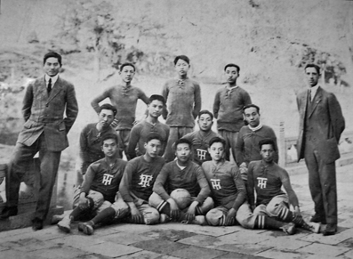 1914年的足球队,左一为潘文炳,右一为休梅克