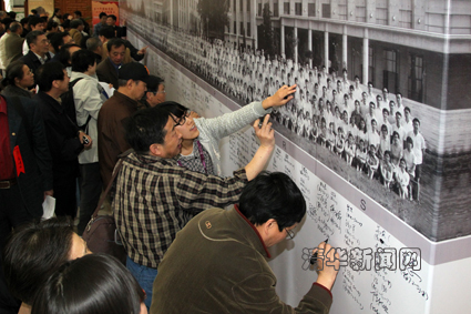 图为校友在巨幅毕业照片前寻找当年的身影并签名。记者 郭海军 摄