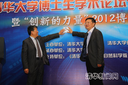 郭新立司长与陈吉宁校长共同按下屏幕上的按钮,启动“创新的力量”2012乐动平台博士生学术论坛。