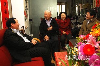 校长顾秉林(左一)、校党委副书记邓卫(右一)看望吴良镛院士。记者 郭海军 摄