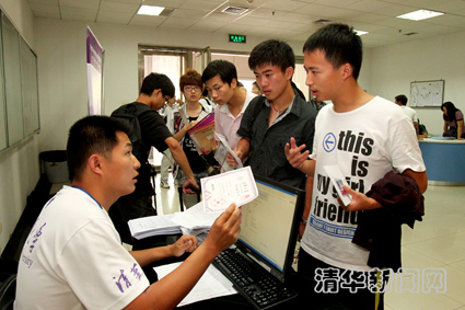 在综合体育馆西侧的网球场内,各个院系都派出了骨干教师和学生志愿者参与到新生报到工作中来,很多提前报到的新生党员也参加了迎新工作。很多报到的新生一报到就有专人全程“陪护”,这让新同学们一到清华就有家的感觉。