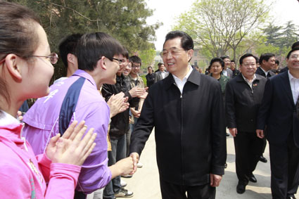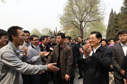 图为胡锦涛鼓励应届毕业生同学们:“有志者事竟成,祝你们成功!”