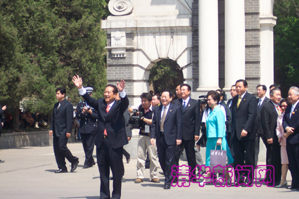 【新闻中心讯 记者 顾淑霞】“欢迎欢迎!期盼两岸和平统一!”在清华学生的欢呼声中,在围观路人热烈的掌声中,约11点钟,宋楚瑜先生一行的车队驶近了二校门。在校长顾秉林等的陪同下,宋楚瑜先生一行走下车,在二校门前驻足。