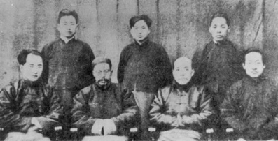 国学研究院部分教师:前排:从左至右分别为李济、王国维、梁启超、赵元任,后排:从左至右分别为章昭煌、陆维钊、梁廷灿。梁启超、王国维、赵元任与陈寅恪四位学者共同被称为“国学研究院四大导师”。