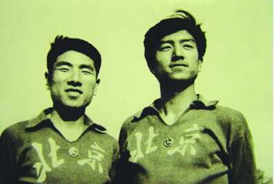 图片说明:1958年11月3日李作英(右)彭铁权在全国马拉松锦标赛上打破全国纪录并获运动健将称号。(佩戴国家运动健将章)