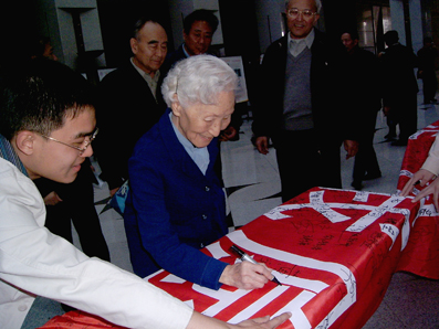 下午,在主楼宽敞庄严的大厅里,陈达将军、朱风蓉将军等多位老校友来到签名现场,在横幅上签名。他们高度评价了这次纪念活动,并对看到那么多同学签名感到高兴。