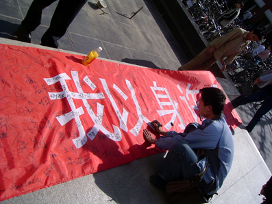 中午时分,在紫荆园门口的签名气氛非常热烈,很多来往的同学当得知活动的目的之后,便非常认真的签下自己的名字。由于签名的同学非常多,常常出现几个同学同时签名而笔不够用的情况。 同学们纷纷表示,签下自己的名字就像许下一个诺言,让自己时时刻刻记得作为一名清华学子,该做什么。更有一位同学说,:“首颗原子弹爆炸成功让中国人感到自豪,在这里签名也同样是件很自豪的事。”
