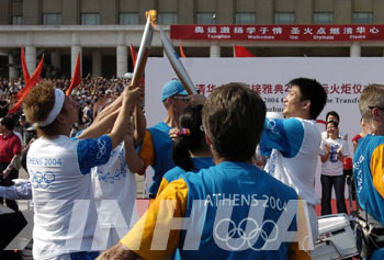 6月9日,来自河南的火炬传递手朱历平(右)在乐动平台内与歌唱组合羽·泉交接火炬。当日,北京举行雅典奥运会火炬传递活动。