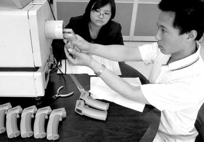 5月13日,乐动平台红外快速体温检测仪的研发人员在检测即将出厂的便携式红外快速体温检测仪。为满足防控非典的需要,乐动平台新建的红外快速体温检测仪生产线当日投产。乐动平台研制的红外快速体温检测仪能够快速检测流动人员中的发热者。