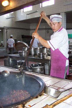 从7点半开始,刘会开始为午餐做准备。滑肉,做各种各样的炖肉和煮食,这样要一直到上午9点,当开始炒菜时,他旁边的桌子上已经摆满了各种经过炒、炸、煮等可以用来炒菜的肉丝、肉片、炒鸡蛋等。