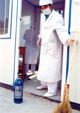 送饭的时候,来自成都的王师傅总是喜欢打听对方是不是四川人,我开玩笑说我是,有没有什么好处给我啊,他说没有,他在找老乡。我问他,在这里服务怕不怕?他说不怕,在这里发烧的人,基本上没有“非典”的。而且,现在科学家在研究一种药,打到身体里以后,一百年不得“非典”,不过,现在还没有研究出来。