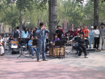 10食堂旁边的小树林不时传来优雅的音乐和一阵阵的叫好声。学校艺术团的同学们正在这片露天的空地上表演节目,为清华92岁的生日献上一份特别的礼物。